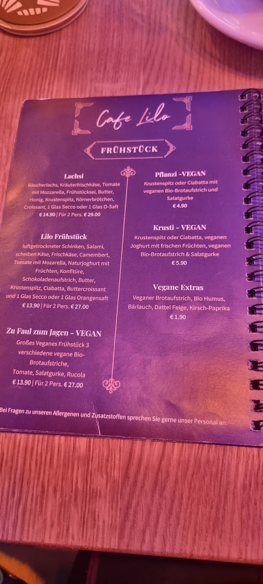 The menu structure generally includes categories for coffee and other beverages, breakfast plates, and bakery items. This setup caters to guests looking for quick orders or casual dining during morning hours or coffee breaks. Items such as the Brotkorb Zum Frühstück Bellissima and the Lilo Frühstück indicate a range of breakfast combinations, while unique selections like Μπουγάτσα suggest additions of regional or specialty pastries.